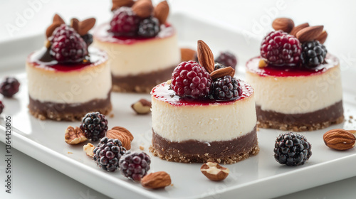 Photo of small creamy cheesecakes with nuts and berries on a white plate, isolated on a light background