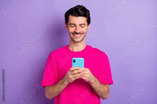 Photo of young happy cheerful good mood positive man blogger influencer use cellphone isolated on violet color background