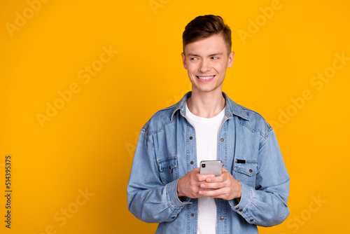 Photo of young man look empty space use mobile app button download isolated over yellow color background