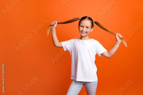 Photo portrait of pretty small girl hold tails cheerful playful have fun wear trendy white outfit isolated on orange color background