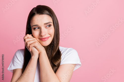 Photo portrait young woman smiling in casual outfit tender cute looking copyspace isolated pastel pink color background