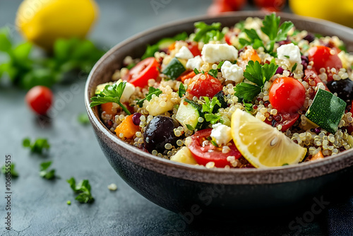 Photo Quinoa Salad, Feta, Cherry Tomatoes, Olives, Herbs, Zucchini