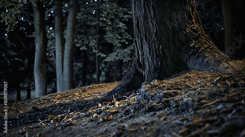 photo real close up of tree trunk with other trees in background and large earth mound above ground view at night