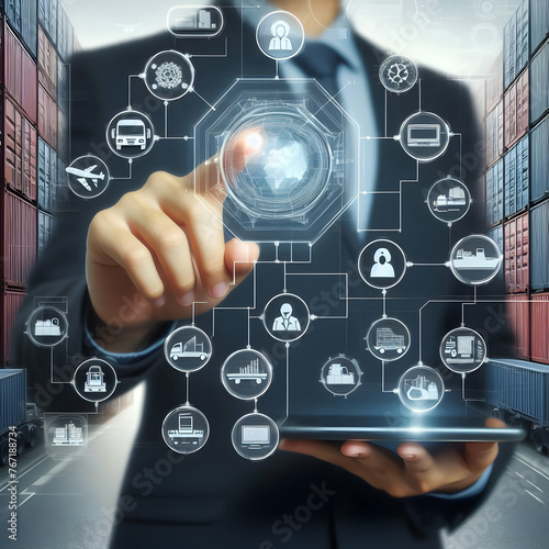 Photo real for Close-up of a manager hand pointing at a logistics flowchart, soft focus on shipping containers in the background in Digital innovation abstract theme ,Full depth of field, clean bright