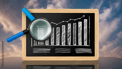 Photo Realistic Blackboard with Bar Charts and Magnifying Glass | Detailed Analysis and Business Growth Concept | Stock Photo