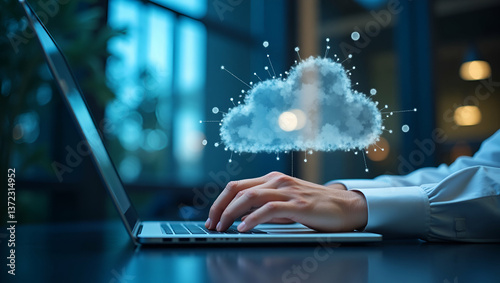 Photo Realistic Double Exposure of a Person Using a Laptop with Cloud Computing Interface Symbolizing Cloud Adoption - Stock Photo Concept with Copy Space