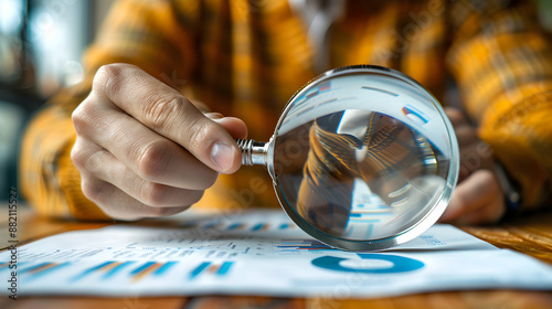 Photo Realistic Image of Person Holding Magnifying Glass with Documents and Graphs, Perfect for Conceptual Analysis and Work Insights Copy Space Included