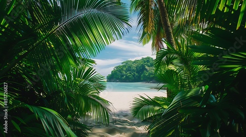 Photo realistic tropical beach seen through lush green palm trees, perfect for a serene and relaxing getaway