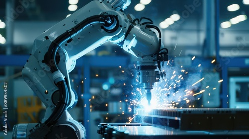 Photograph a robot performing intricate welding tasks in a modern factory setting. Emphasize the precision and consistency of robotic welders