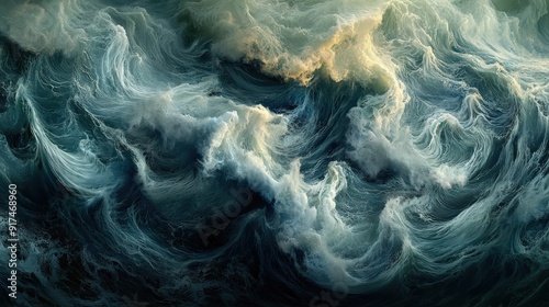 Photograph from directly above the Pacific Ocean, featuring turbulent waves with intricate patterns and intense movement