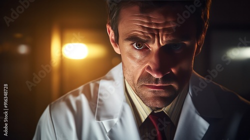 Photograph of a male doctor in a close-up portrait, his face illuminated by the warm glow of a medical lamp