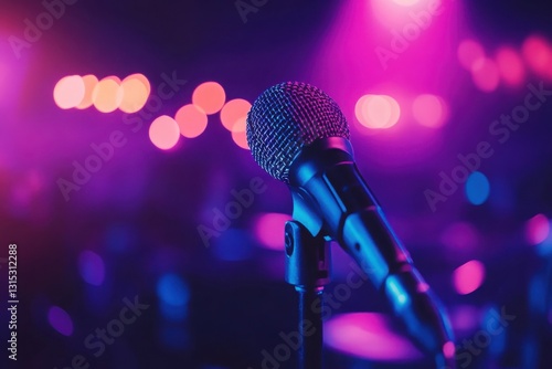 Photograph of a microphone on stage with blurred lights and crowd in the background, featuring purple and blue