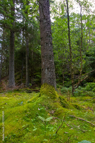 Photograph of a tree in the forest. Green moss is covering the ground and the lower part of the tree.