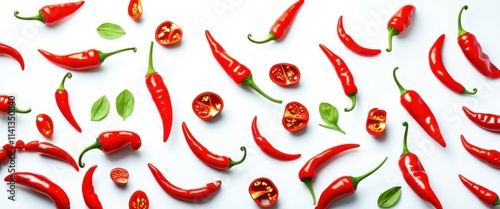 Photograph of a variety of red chili peppers, including whole peppers and sliced peppers, scattered across a white background. The peppers are vibrant red, with green stems and leaves. The lighting is
