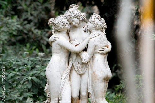 Photograph of three female muses embracing each other, made of white marble with a green floral background.