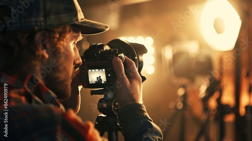 Photographer capturing images in studio setting with camera, blurred background - photography, capture, studio.