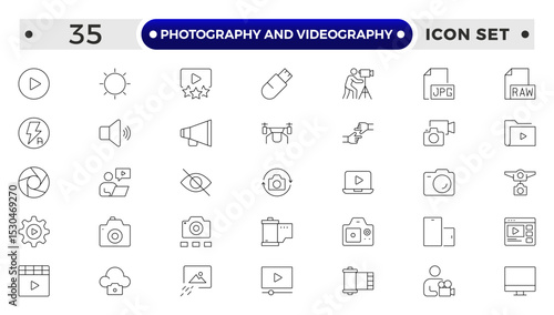 Photography and Videography outline Icon set. Camera, Lens, Studio, Film Equipment, Digital Camera, Tripod, Editing Tools,DSLR, Film Reel, Media Tools, Lights, Action, Capture, Focus, Vector Set.