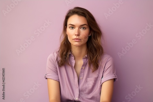 Photography in the style of pensive portraiture of a glad girl in her 30s wearing a casual short-sleeve shirt against a lilac purple background. With generative AI technology