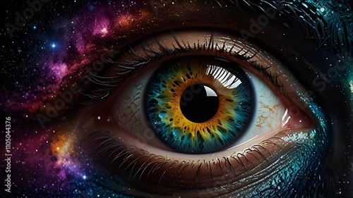 Photorealistic close-up photo of a single eye set against a backdrop of intricate, iridescent textures that resemble a galaxy. The eye, with its deep, penetrating gaze and detailed, multi-hued iris.