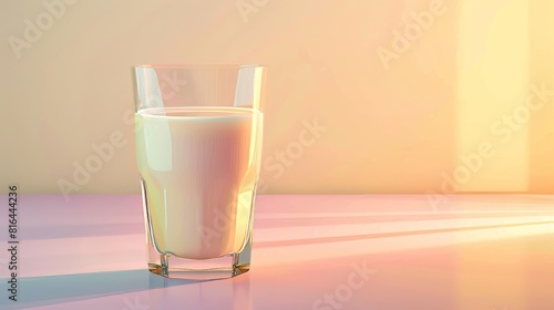 Photorealistic illustration of a glass of milk against a pastel background with copy space for text or logo, beautifully illuminated by studio lighting