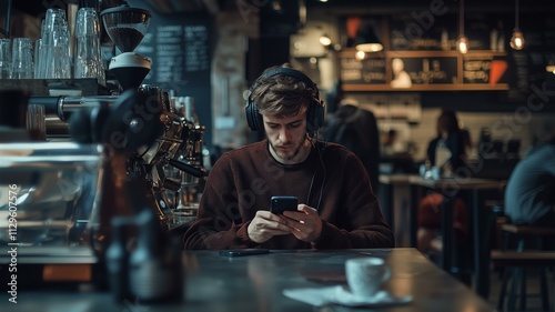 Photorealistic image of a man in a busy coffee shop, isolated by headphones and a screen, showing digital detachment and loneliness