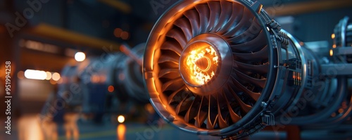 Photorealistic image of an air jet engine, focusing on the combustion stage with vivid.