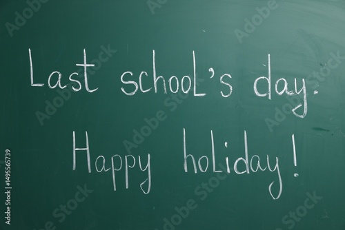 Phrases Last School's Day and Happy Holiday with exclamation mark on blackboard