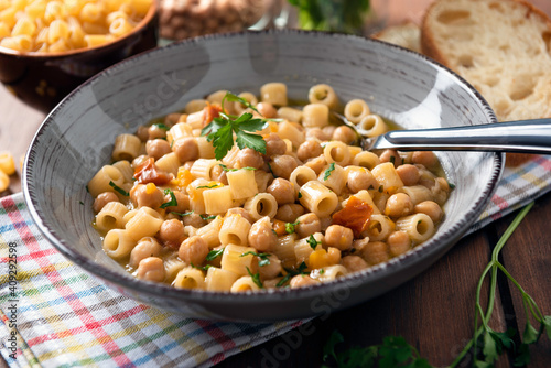 Piatto di saporita pasta e ceci, tipico piatto della Cucina Italiana