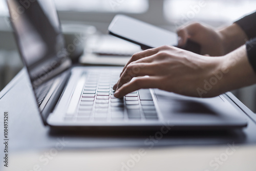 Picture focuses on a woman's hands typing on a contemporary laptop keyboard, office setting appearing blurred