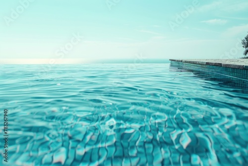 Picture of an empty swimming pool with a beautiful ocean view. Suitable for travel and vacation concepts