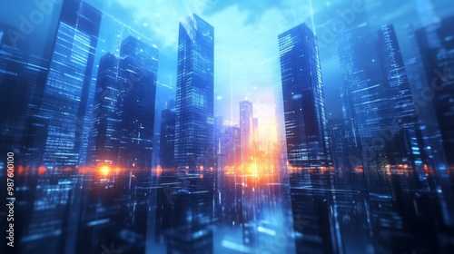 Picture of modern skyscrapers of a smart city, futuristic financial district with buildings and reflections , blue color background for corporate and business template with warm sun rays of light