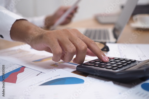 Pictures of businessmen are pressing the calculator to calculate business information. Documents and graphs about accounting are on the table.
