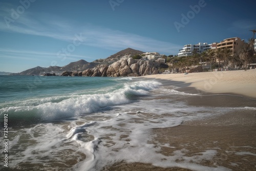 Picturesque beach scene with blue water with waves lapping against the shoreline, ai-generated