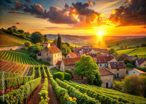 Picturesque French Village Vineyard Sunset, Rolling Hills, Wine Country Landscape