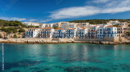 Picturesque Mediterranean coastal village with white buildings and turquoise waters in Greece under a sunny sky