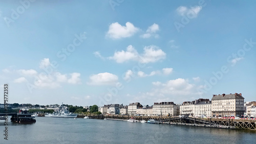 Picturesque riverside city with historic buildings against blue sky with fluffy clouds