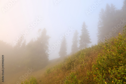 Picturesque view of foggy forest. Beautiful mountain landscape