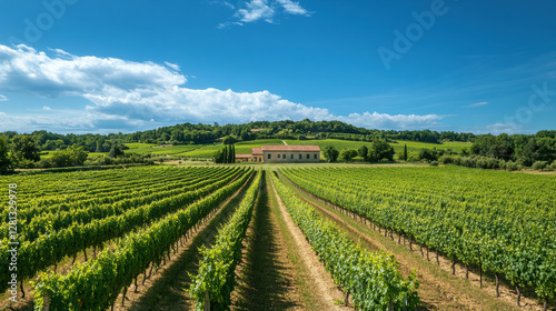 picturesque vineyard with rows of grapevines under clear blue sky, distant farmhouse nestled among rolling hills, and lush greenery surrounding area