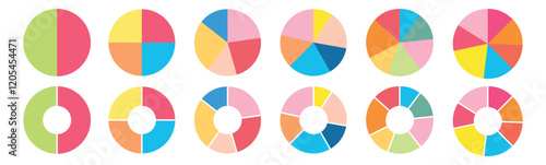 Pie charts diagrams. Different color circles isolated. Infographic element round shape. Pie chart infographic set. Circle diagram collection with sections or parts. Segmented circle icons