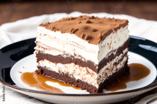 Piece of cake with strawberries and blueberries on a wooden background. Chocolate cake, Tiramisu cake. Generative AI