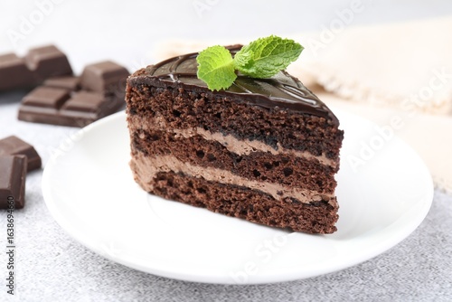 Piece of delicious chocolate cake with mint on grey table, closeup