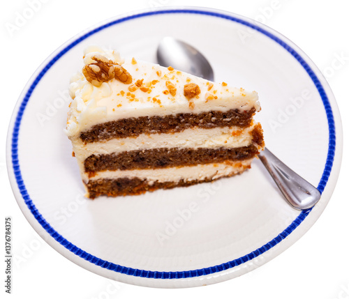 Piece of sweet carrot cake served with topping on plate. Isolated over white background