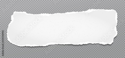 Piece of torn, white realistic grainy horizontal paper strip with soft shadow is on grey background. Vector illustration