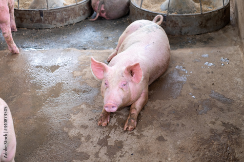 Pig farm in swine business in tidy and clean indoor housing farm, with pig mother feeding piglet