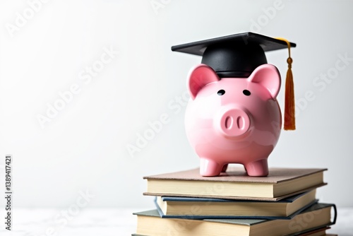 Piggy bank dressed in graduation cap placed on stack of books representing financial education and student success