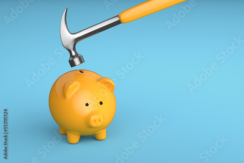 Piggy bank is about to be smashed by a hammer. Using savings for investment concept. Economic crisis.