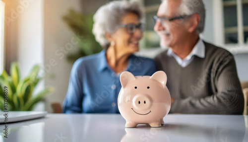 piggy bank on a white table, symbolizing savings, is in sharp focus, while an elderly couple in the background, out of focus, discusses their retirement finances