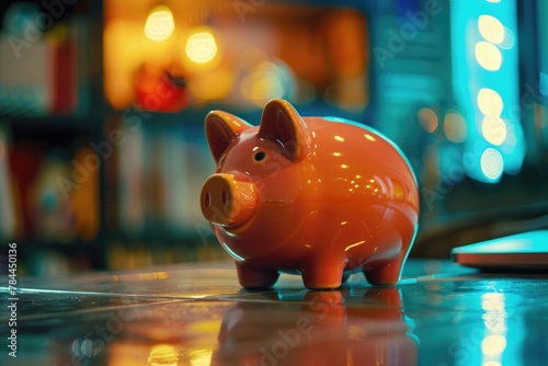 Piggy bank sitting next to a laptop on a table, ideal for financial concepts and savings themes