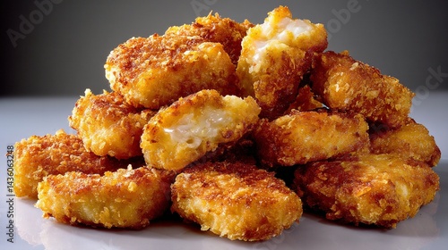Pile of appetizing golden fried breaded bites with soft, creamy filling inside.