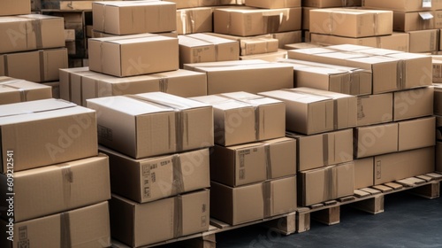 Pile of brown cardboard boxes at warehouse of market. Different stuff packed in carton boxes. Generative AI.